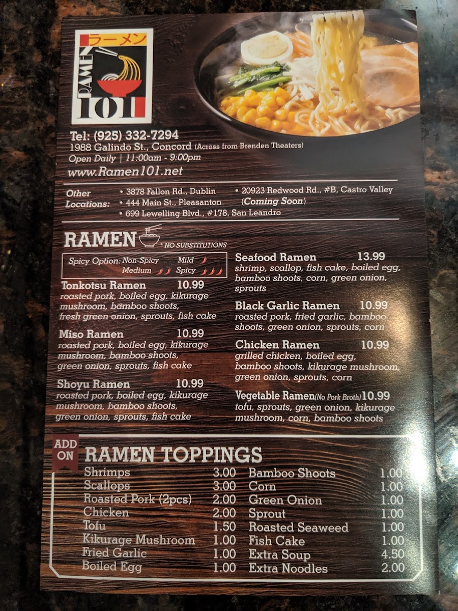 Introducing the menu of Ramen 101 Concord, a delightful eatery located at 1988 Galindo St, Concord, CA. This cozy spot specializes in crafting comforting bowls of ramen that resonate with both tradition and flavor.